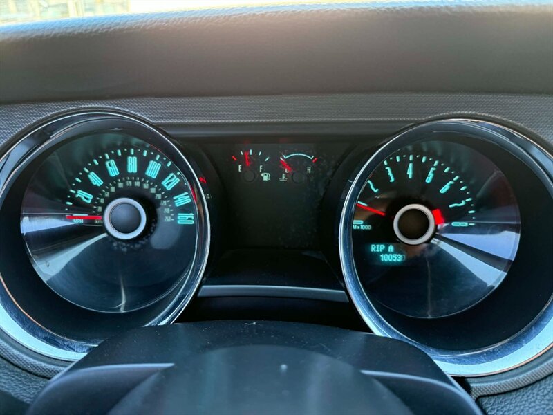 2014 Ford Mustang V6 with the factory 3.7L V6 (305 hp, 280 ft-lb), under 101,000 miles (averaging less than 8,000 miles/year) and rated at 19 MPG city / 29 MPG highway. Factory equipment includes a 6-speed transmission (manual or automatic), Ford SYNC with Bluetooth, AM/FM/CD/MP3 audio with USB and auxiliary inputs, power windows and door locks with remote keyless entry, cruise control, tilt/telescoping steering wheel with audio controls, power mirrors, 17-inch alloy wheels, anti-lock brakes with traction and stability control, front side-impact and side-curtain airbags, and tire pressure monitoring. Exterior is Black with Charcoal Black leather interior; the vehicle is in excellent overall condition.